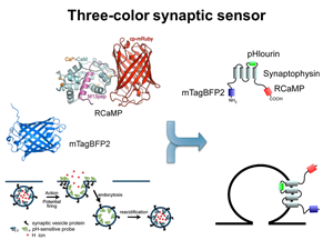Sensors for synaptic Ca2+ and exocytosis. A long-standing goal in neuroscience has been to ‘see’ the Ca2+ that triggers synaptic transmission. The lab recently succeeded in imaging Ca2+ signals and vesicle release in the same synapse in response to a single action potential, by targeting the genetically encoded Ca2+ indicator GCaMP6s and the red-shifted pH-sensitive probe mOrange2 to synaptic vesicles (SVs).